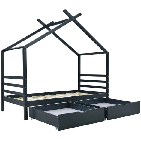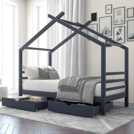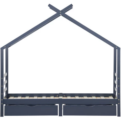 AOMMO Lit Enfant, Lit Cabane En Bois Massif Avec 2 Tiroirs Et Sommier à Lattes 90×190 Cm Bleu Marine