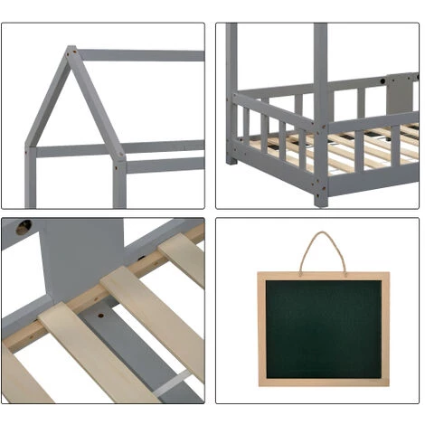 AOMMO Lits Enfants, Cadre De Lit Maison En Bois Avec Tableau Noir 90 X 200 Cm Gris