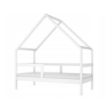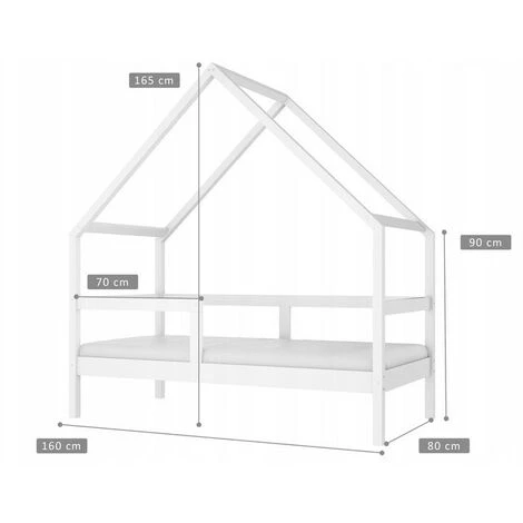 Un lit bébé de type maison avec une surface de couchage de 160 x 80 cm, en bois de pin durable. Le cadre renforcé permet également de tenir un adulte. Le lit bébé a une barrière pour l’empêcher de tomber.