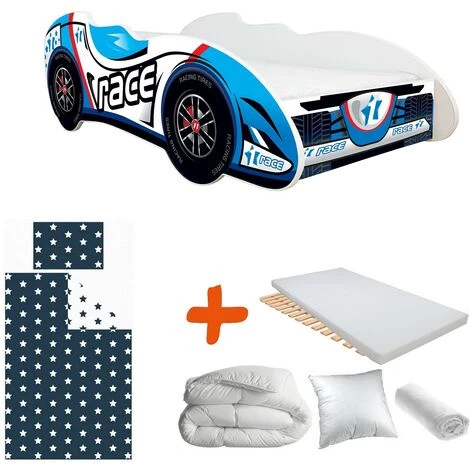 Pack complet : Lit enfant voiture + Matelas + Parure Coton + Oreiller + Couette+Drap Housse