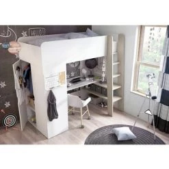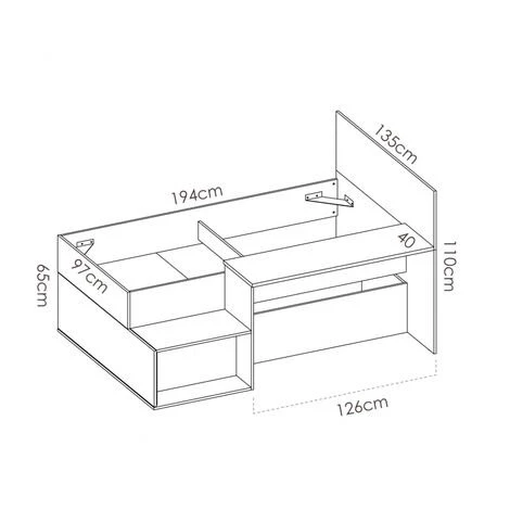 - Ses dimensions de 194 x 135 x 110 cm en font un lit pratique adaptable quelle que soit la dimension de votre pièce. Il permet d’apporter d’un seul bloc Bureau, rangement et couchage.