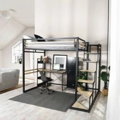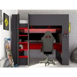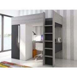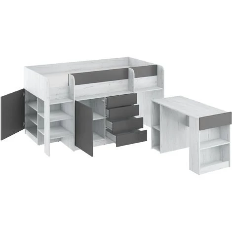 Le meuble se compose d’un lit superposé, d’un bureau gigogne, de 2 casiers, de 4 tiroirs, et de nombreuses étagères.