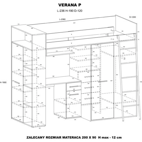 BIM FURNITURE Lit Superposé Mezzanine VERANA Droite Chêne Artisanal / Bleu – CHÊNE ARTISAN / BLEU