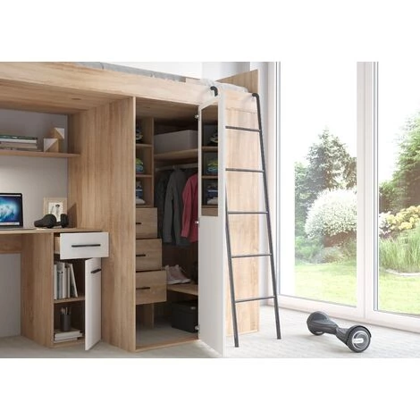 Meuble ergonomique, pratique et fonctionnel pour une chambre de jeune. La mezzanine est un lit superposé qui comprend également un bureau, une bibliothèque et une grande armoire. Cela permettra un aménagement très pratique de l’espace dans la pièce.DIMENSIONS DES MEUBLES :Largeur : 236 cmProfondeur : 120 cmHauteur : 190cmLe coin couchage : 90×200 cmHauteur de matelas recommandée : 12 cmInformations:Conception : panneau stratifié de 16 mm.Bordure ABSUne fermeture tranquilleLe mobilier ne comprend pas de matelasUn meuble à monter soi-même.Le mobilier a un certificat de sécurité et peut être utilisé par les enfantsD’autres versions de couleurs sont disponibles sur nos autres enchères.L’offre ne comprend pas les décorations présentées ni le matelas.Couleurs au choix :Blanc artisanal / GraphiteChêne sonoma clair / BlancChêne sonoma clair / VioletOr artisanal / JauneChêne Artisan / VertChêne Artisan / Bleu