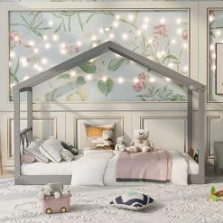 AZKOEESY Lit Cabane En Bois Pour Enfants 90 X 200 Cm Avec Tableau Noir, Gris (sans Matelas)