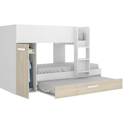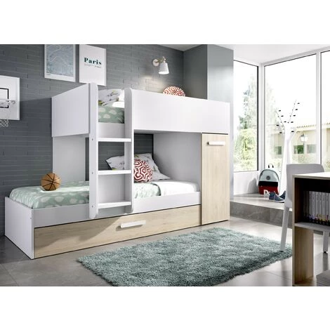 Lits superposés Crystal pour deux enfants Blanc mat et naturel avec armoire