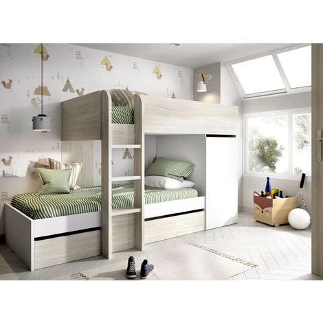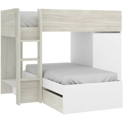 Lits superposés Dalia Blanc mat et Chêne gris avec armoire et deux tiroirs