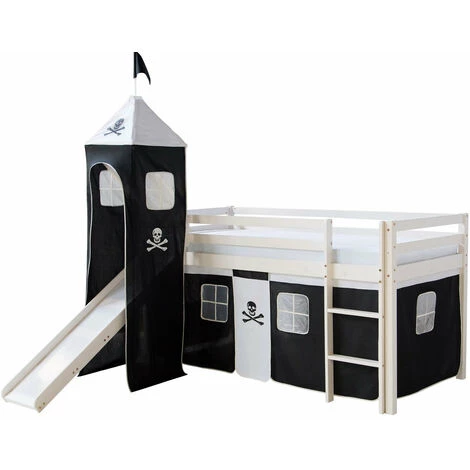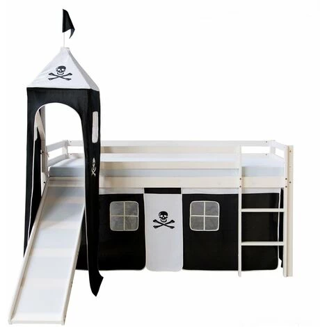 Lit mezzanine avec sommier à lattes et toile de décoration noir pirate incluse.