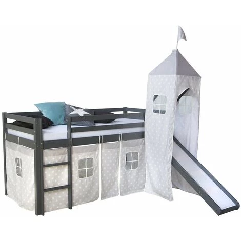 Lit mezzanine avec sommier à lattes, tobbogan et rideau gris avec étoile