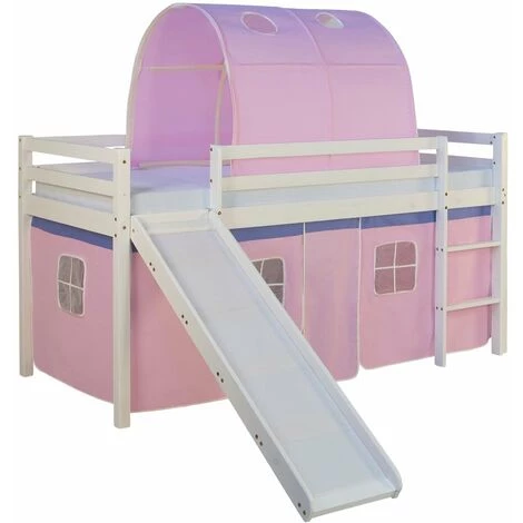Lit mezzanine avec sommier à lattes et toile de décoration rose incluse.