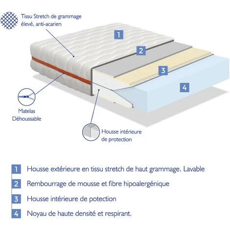 - Matelas déhoussable. Il a deux housses. La housse extérieure est en tissu extensible doux et élastique. La housse intérieure est en tissu de protection multi-élastique pour faciliter le retrait et protéger le noyau de notre bébé.