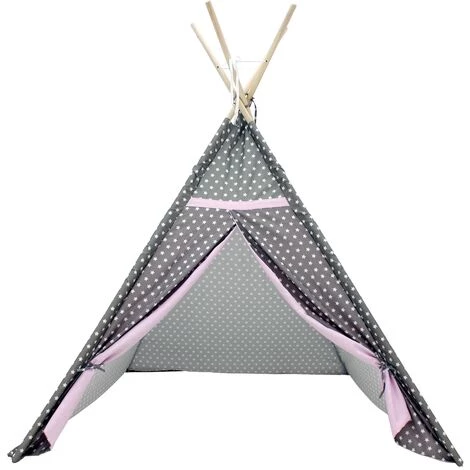 Le joli design en bois naturel et en tissu gris avec des étoiles et des portes de tente roses attire tous les regards, que ce soit dans la salle de séjour ou dans la chambre des enfants. Avec son atmosphère chaleureuse et sa petite fenêtre, le tipi est l’endroit idéal pour jouer, se cacher et rêver. Grâce à son sac de transport pratique de même conception et à son montage très facile, la tente est aussi une parfaite protection contre le soleil dans le jardin ou sur la plage lors des chaudes journées d’été.