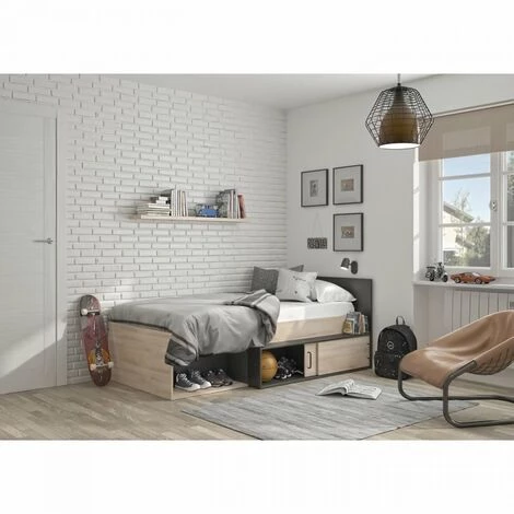 ERQUY Lit enfant avec multi-rangement – 1 niche et 2 portes coulissantes – Coloris : Chene Kronberg clair et Noir – Structure en panneaux de particules revetus de papier décor – Couchage : 90 X 200 cm – Vendu sans sommier, ni matelas – Dimensions totales : l110 x H80 x P204 cm