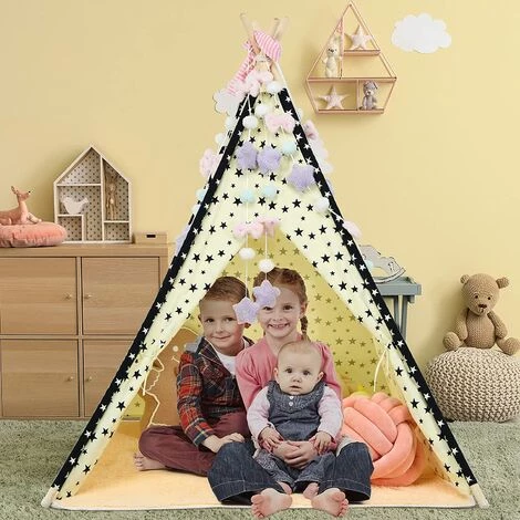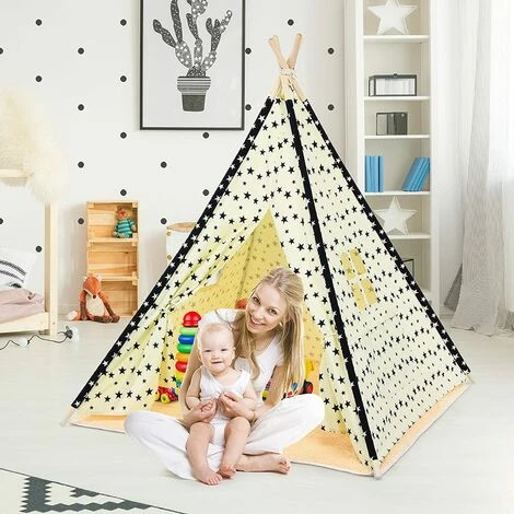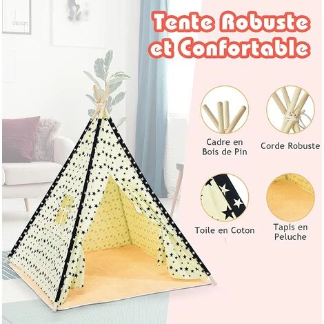 - Notre tipi offrira un plaisir et une fantaisie sans fin à vos petits. Convient aux enfants de tous âges, peut être un château, un vaisseau spatial, un coin lecture, mais aussi une superbe décoration pour votre maison. Il offre suffisamment d’espace pour jouer à l’intérieur. La maison de jeux est une tente indienne et dispose d’un cadre en bois de pin massif, ce qui la rend robuste et stable sur le sol. Vous pouvez facilement ranger la tente dans le sac de transport inclus lorsqu’elle n’est pas utilisée ou l’emporter à l’extérieur.