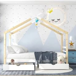 Créez le refuge ultime dans la chambre de vos enfants avec notre cadre de lit fantastique ! Le lit est intelligemment conçu avec un cadre de style maison dans un arbre où vous pouvez accrocher des rideaux de lit pour créer de l’intimité pour votre enfant. Il peut également être utilisé comme coin lecture ou maison de jeu pour votre enfant. Fabriqué en bois de pin massif, ce cadre de lit est extrêmement robuste et durable. Les lattes résistantes offrent le soutien nécessaire et sont très confortables. Ce cadre de lit convient à un matelas de 90 x 200 cm. Veuillez noter que la livraison inclut un cadre de lit seulement ; un matelas et les rideaux ne sont pas inclus. Le lit est facile à assembler. Vous pouvez chercher le matelas correspondant dans notre boutique.