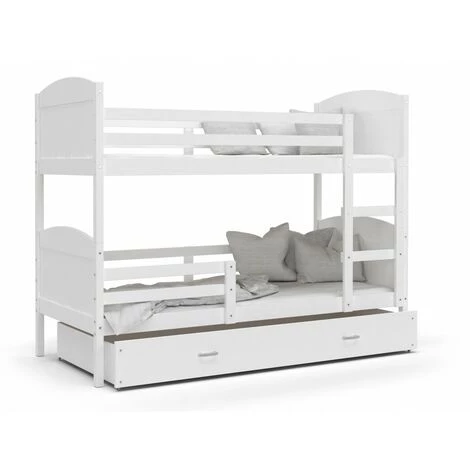 Lit superposé MATEO 90×200 livré avec tiroir, 2 sommiers et 2 matelas en mousse de 7cm. Ce lit s’intègre parfaitement dans toutes les chambres d’enfant, grâce à un design simple et moderne. Ce lit superposé se distingue par ses jolies formes. Ce genre de lit convient aussi bien à un enfant, à partir de 3 ans, qu’à un adolescent, grâce à sa barrière de sécurité supplémentaire qui protège des chutes de jeunes enfants. Le lit est fourni avec tiroir de rangement pour ranger votre linge ou des jouets des enfants. Le meuble en BOIS et Mdf lui garantit une bonne durée de vie. Modulable : séparable en deux lits indépendants et une échelle positionnable à gauche ou à droite. Nos lits sont fournis dans les colis en carton, en pièces détachées pour l’auto-assemblage.