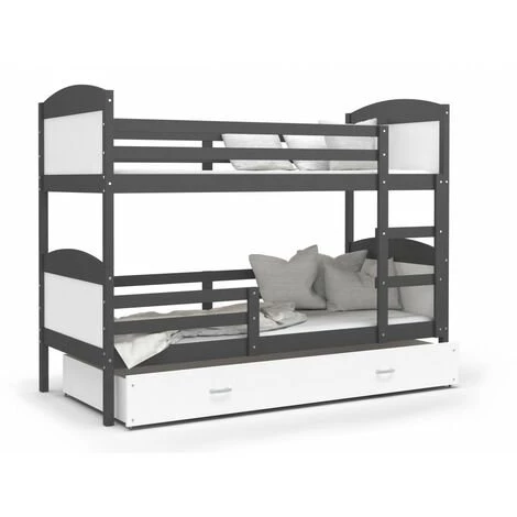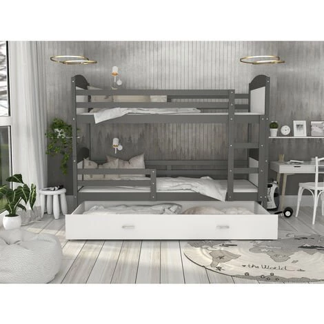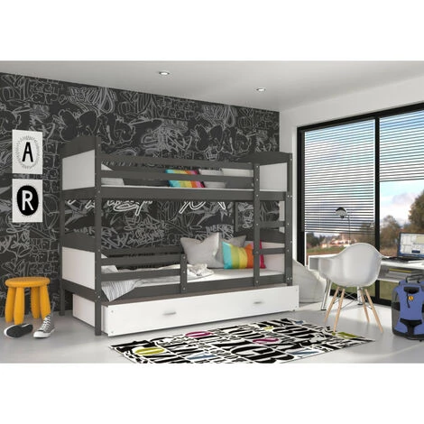 Lit superposé MATIS 90×190 livré avec un tiroir et 2 sommiers. Ce lit s’intègre parfaitement dans toutes les chambres d’enfant, grâce à un design simple et moderne. Ce lit superposé se distingue par ses jolies formes. Ce genre de lit convient aussi bien à un enfant, à partir de 3 ans, qu’à un adolescent, grâce à sa barrière de sécurité supplémentaire qui protège des chutes de jeunes enfants. Le lit est fourni avec tiroir de rangement pour ranger votre linge ou des jouets des enfants. Le meuble en BOIS et Mdf lui garantit une bonne durée de vie. Modulable : séparable en deux lits indépendants et une échelle positionnable à gauche ou à droite. Nos lits sont fournis dans les colis en carton, en pièces détachées pour l’auto-assemblage.