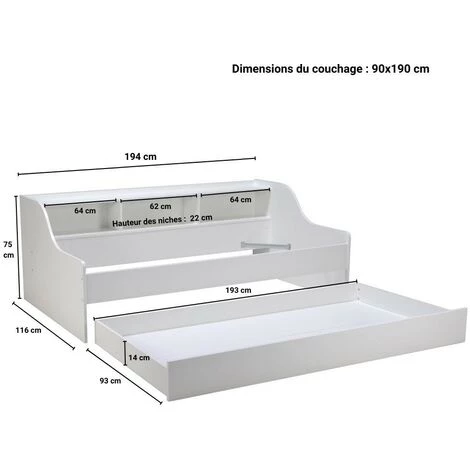 Astucieux, il vous permet d’optimiser l’espace dans une petite chambre grâce à ses niches de rangement qui peuvent par exemple servir de table de chevet, et permettent à votre enfant de ranger ses jouets, livres et doudous à proximité de son lit.