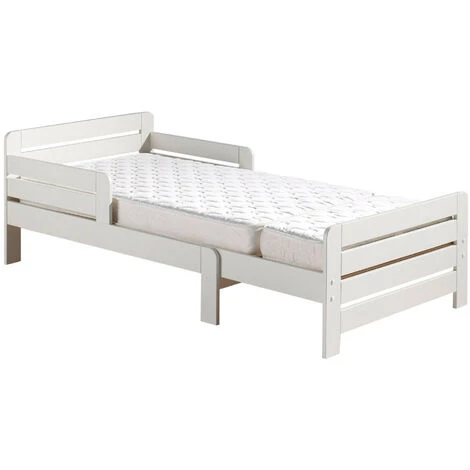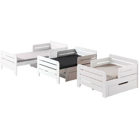 Ce somptueux lit évolutif s’adaptera parfaitement à votre enfant tout au long de sa croissance. Sa structure peut se transformer en 3 couchages différents : un lit bébé 90×140 cm, un lit junior de 90×160 cm et un lit enfant 90×200 cm. Sa structure en pin massif est à la fois robuste et résistante, ce qui garantit un confort inouï. Un tiroir peut aussi s’y intégrer pour optimiser votre rangement et avoir une chambre harmonieuse.Couchages: 90×140 cm – 90×160 cm – 90×200 cmMatière : Pin massifCouleur : BlancDimensions : L 147/167/207 x H 72 x P 102 cmPoids: 25 kgSommier : inclusNombre de colis : 2Garantie : 2 ansFabrication : BelgiqueNous ne livrons pas en Corse.