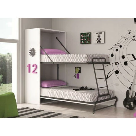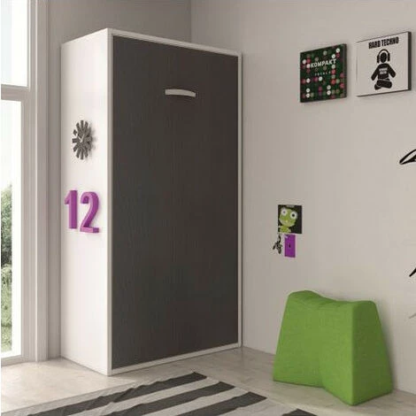 Magnifique lit superposé escamotable verticale gris foncé pour deux couchages de 90×190 cm avec un système d’ouverture sécurisé et freiné. Il est livré avec une échelle très robuste en acier trempé d’excellente qualité. Une idée ingénieuse d’optimiser l’espace de votre intérieur : les 2 lits coulissent à l’aide d’un système parfaitement sécurisé pour s’insérer dans une jolie armoire discrète verticale.Le poids supporté par lit est de 180 kgAux normes élevées de fabrication et d’innovations techniques font de cet ensemble un véritable avantage. Les ressorts à gaz permettent une ouverture et une fermeture silencieuses et adaptées à tous publics. Il est équipé d’un support de butée et répond ainsi aux exigences les plus élevées. L’installation se fait sans effort et rapidement.L’accès au lit supérieur se fait par une échelle parfaitement sécurisée. En partie supérieure le matelas est sécurisé par des butées et une barrière de sécurité. Le lit est fabriqué en panneaux de particules robustes et, malgré son faible poids, il est très résistant. Des sangles solides munies de fermetures à déclic maintiennent le matelas de sorte qu’il ne glisse pas. Le pied pliant robuste assure une position ferme pendant la nuit. Les oreillers et les couettes ne nécessitent aucun espace supplémentaire pendant la journée, ils peuvent rester sur le matelas du lit fermé.Sécurité optimisée 2 vrais lits confort dans un espace tout petitLes pied se déploient mécaniquement, sans effortsSystème de sécurité aux normes pour la sécurité pour les plus petitsTêtières / barrières de sécurité incluesFaible encombrement en profondeurOuverture silencieuse assistée et sécurisée par vérinsSécurité anti-basculementPossibilité d’intégrer un matelas jusqu’à 22 cm d’épaisseurPieds invisibles lorsque l’armoire lit est en position ferméeStructure : Panneaux de particules 19 et 35 mm d’épaisseurColoris : gris foncéCouchage : 90×190 cmStructure: Panneaux de structure en mélamine haute densité avec des finitions extérieures de 30 mm et des finitions intérieures de 20 mm.bords en PVC de 2 mm.Systèmes d’assemblage avec excentrique métallique.Forme de la plinthe: 10,5×1,5 cmSystème pliant:Ouverture relevable par un système de guides actionné par des ressorts à gaz hydrauliques.Les amortisseurs à gaz assurent une descente lente et sans danger, ce qui permet de rabaisser le lit sans effort.Système de sécurité anti-roulis et anti-blocage avec la couchette en position fermée, au moyen d’un système de retenue intégré dans les ressorts hydrauliques.Lit de base:Structure en tube d’acier renforcée avec des panneaux de particules de mélamine haute densité.Barrière de sécurité en partie haute.Dimensions armoire fermée : L.107 x P.60 x H.214 cm Dimensions armoire ouverte : L.107 x P.241 x H.214 cmSommier 24 lattes inclus par couchageHauteur du sommier du bas : 34 cmHauteur du sommier du haut : 115cmPoids maximal supporté par lit 110 kgMatelas en optionCe meuble doit obligatoirement être fixé à un support fixe à l’aide des équerres fournies.Les lits sont livrés avec des chevilles pour murs pleins.Certifications LABEL Bois Certifié PEFC – Garantie 10 ans – Oeko Tex Standard 100 – ECOCERTComposition: panneaux de particules mélaminés de 19 à 35 mm d’épaisseur – Piétement : métal brossé mat, système de retournement manuel – Montage à deux personnes et fixations murales obligatoires (accroches fournies) – Norme : CE Garantie 10 ansNous ne livrons pas en Corse.