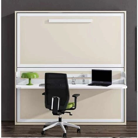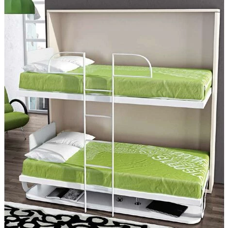 Très facile d’utilisation, l’armoire bureau lit superposé pour deux couchages de 90×190 cm de la collection Melina vous séduira par son élégance et sa robustesse.Il vous garanti une optimisation de place importante. Le couchage du haut est sécurisé par une rambarde latérale et accessible par une échelle escamotable. Le poids supporté par lit est de 180 kgCouchage 90 x 190 cm – H 207 x L 214 x P 34.5 cmPoids supporté par lit 110 KgEncombrement Lit ouvert : Largeur : 213 cm – Profondeur 105 cmHauteur du 1er couchage 30 cm, du second 128 cmBureau profondeur 35 cmSupport en bois et poignées en métalEncadrement en métal blanc ( structure dans les option pour la couleur)Facade plusieurs coloris disponibleNe nécessite pas de sommier.Le couchage du haut ne convient pas aux enfants de moins de 6 ans.Il doit être utilisé obligatoirement avec l’échelle.Fixation murale obligatoire sur 3 points.Fabriqué en Europe, dans le respect des normes CE de l’environnement.Garanti 5 ans contre tout vice de fabrication.Matelas en Option de 18 cm de hauteur très grande qualité de fabrication Européenne.Dimensions maximum matelas : 90 x 190 x 20 cm (18 cm de hauteur pour laisser une couette).Revêtement Strecht – Matelassage viscoélastique adaptable – Transpirable avec des fibres athermiques – Mousse 30 KG. HR – mousse visco 3 cm.Livré par une société de transport de meubles sur prise de RDV à votre convenance.Nous ne livrons pas en Corse.