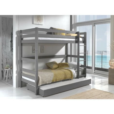 Ce magnifique lit superposé gigogne 90×200 cm embellira la chambre de vos enfants. Sa structure en pin massif assure un meuble résistant et durable. Le tiroir lit pourra accueillir un matelas 90×190 cm de couchage.Matière : Bois pin massifCouleur : GrisCouchage: 90 x 200 cmDimensions lit: L 209 x H 180 x P 105 cmDimensions tiroirs: L 197 x H 19 x P 94 cmPoids : 84 kgNombre de colis : 4Sommier: InclusGarantie : 2 ansFabrication : BelgiqueNous ne livrons pas en Corse.