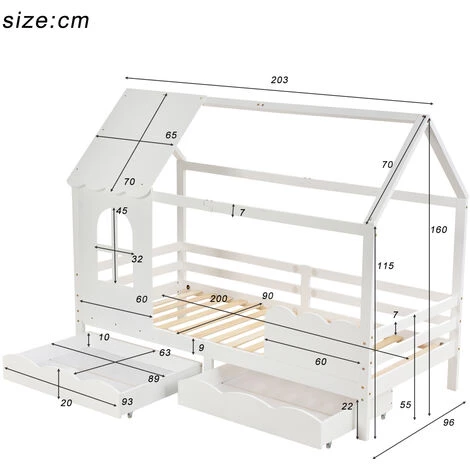 - Deux tiroirs de 63 x 89 x 20 cm offrent un grand espace de rangement pour les draps, les jouets et les vêtements, et la boîte spacieuse avec roulettes et poignées encastrées est facile à ouvrir ou offre beaucoup d’espace en dessous pour passer l’aspirateur. La taille du lit convient également aux petites pièces
