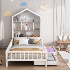 Lit Enfant Simple 90 X 200 Cm – Avec Tête De Lit Bibliothèque Et 2 Tiroirs-Blanc Bois Massif LBF