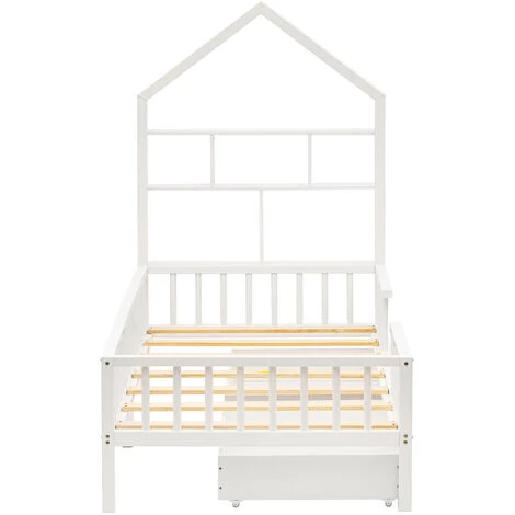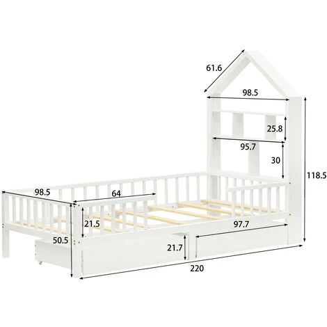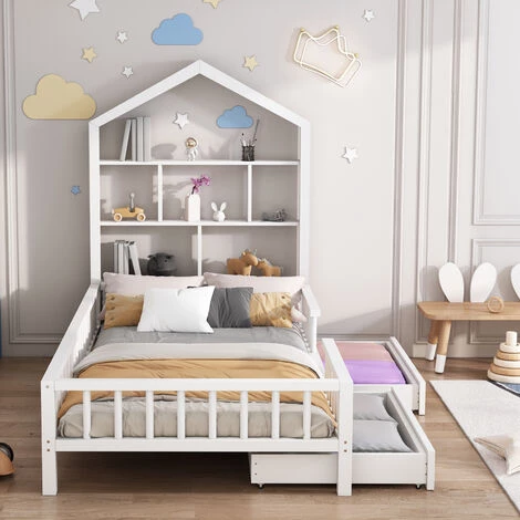 - Ce meuble d’inspiration scandinave combine les fonctions d’une bibliothèque et d’un lit. La tête de lit de ce lit pour enfant est une étagère qui peut également être utilisée comme étagère pour les livres pour enfants, les outils et quelques petits objets. Ce lit enfant dispose également de deux grands tiroirs de rangement sous le lit. Le design fonctionnel de ce produit est bien pensé et très pratique.