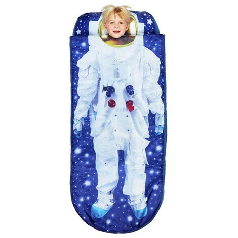 Lit d’appoint gonflable 2-en-1 avec couette intégrée. Grâce son oreiller et sa couette doux, douillets et lavables en machines, le ReadyBed reste toujours propre et frais, avec sa pompe et sa housse de transport incluses, le sac se transforme en lit en un clin d’œil. Idéal pour camper ou dormir chez les copains : votre enfant se sentira comme chez lui où qu’il aille. Dès 3 ans. Dimensions : H20 x L62 x P150 cm. Couleur : bleu. Poids : 1.46 kg