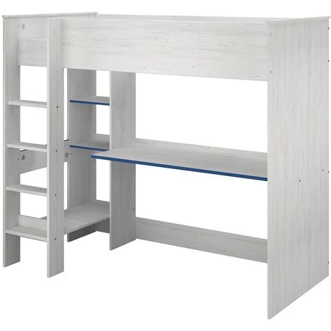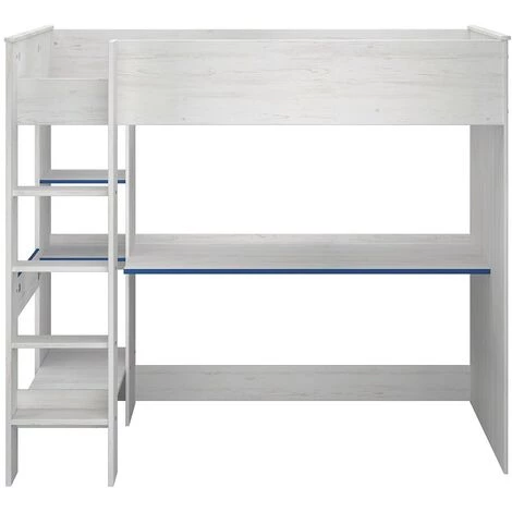 - Lit surelevé avec bureau, couchage 90×200, étagère avec 3 tablettes.