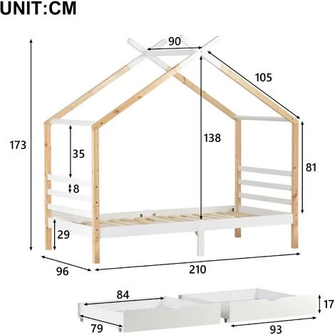 Notre lit cabane présente un design en forme de maison avec un toit fantaisiste. La construction unique vous permet d’ajouter un sens imaginatif de créativité à la chambre de votre enfant. Vous pouvez également installer des tentes, vos enfants peuvent jouer à cache-cache avec leurs amis ou leurs frères et s?urs et s’offrir un sommeil s?r et sain.Le bois de pin certifié FSC est solide et s?r, inoffensif pour les enfants et favorise le développement durable.