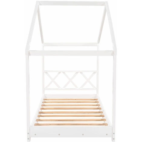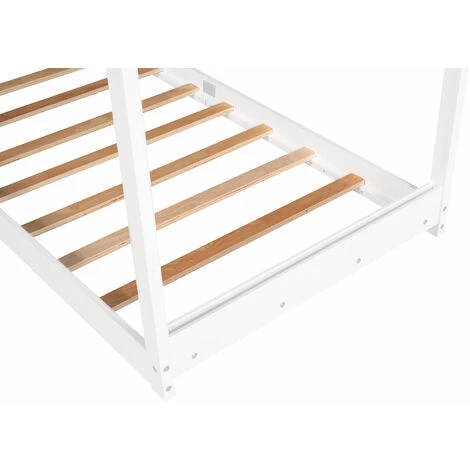 Ce lit de maison super cool est parfait pour les enfants. Vous pouvez créer une retraite fra?che dans la chambre et laisser libre cours à l’imagination de votre enfant. Grace à son cadre polyvalent et simple, vous pouvez le décorer selon la personnalité de votre enfant, par ex. B. avec des tissus drapés, des lanternes suspendues ou des jouets. Ce lit en bois est également parfait pour le coin lecture ou la salle de jeux de votre enfant. Fabriqué en bois de pin massif, ce cadre de lit est très solide et durable. Remarque : la livraison comprend uniquement le cadre de lit et les sommiers à lattes avec une capacité de charge de 160 kg
