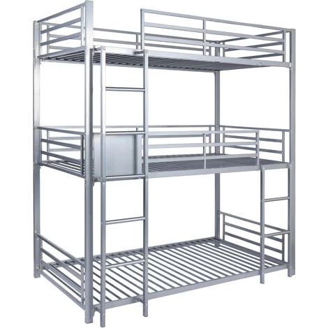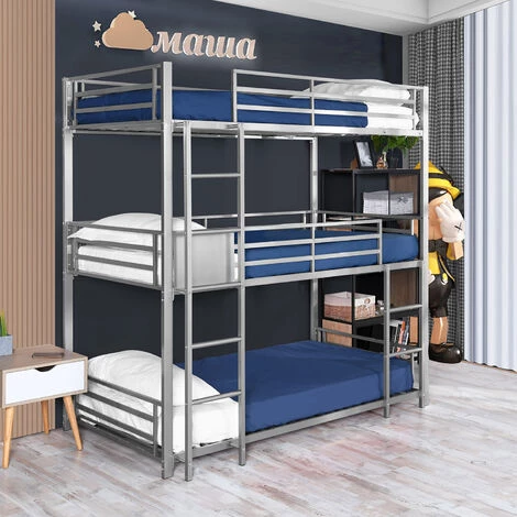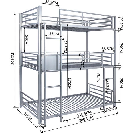 – Lit superposé de 3 couchage robuste et solide grâce à sa structure en métal, il est équipé d’échelles et de barrière anti-chute pour une securité optimale.