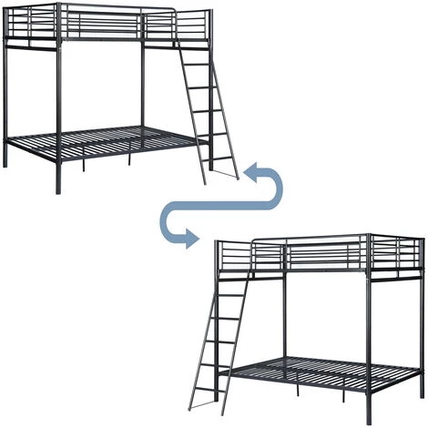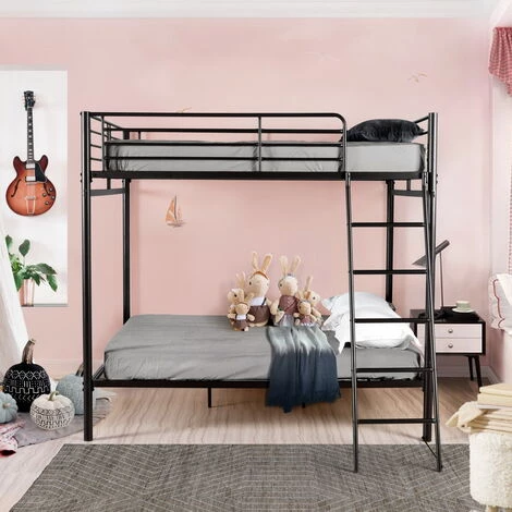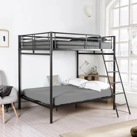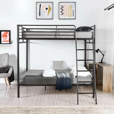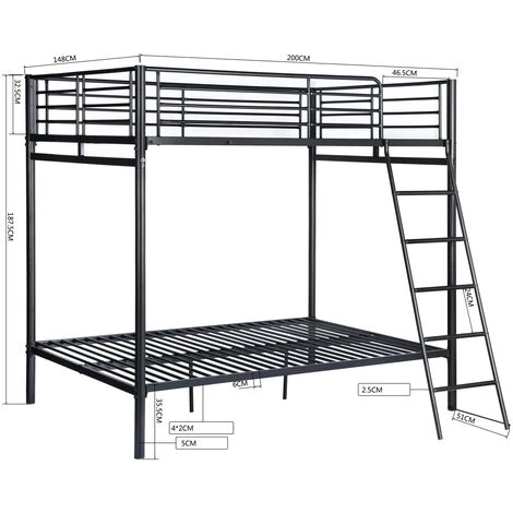 Doté d’un style moderne, notre lit superposé en métal noir apportera du caractère à votre espace et sera également un gain de place. Notre échelle est très pratique ! En effet, elle est interchangeable et vous pourrez la placer à droite ou à gauche selon la disposition de votre chambrePar précaution, ce lit est réservé aux enfants de 6 ans et plus. Le cadre de lit possède des barrières hautes et épaisses afin d’empêcher les chutes.Caractéristiques- Sommiers à lattes en métal fournis 2 couchages de 140 x 190 cm, matelas non inclus.- Le lit supérieur est équipé de barrières anti-chutes et d’une échelle sécurisé- Le matelas adapté pour ce lit doit avoir une hauteur de 16cm maximum.- Il est conseillé de caler le lit au mur si possibleDimensions du produit- Hauteur: 187,5cm- Largeur: 148cm- Longueur : 201cmDimensions du colis 2 colis1/2 : 202.5×51.5×10.5 cm2/2 : 148.5x52x15.5 cmInclus : 1 lit, 1 manuel d’instruction et les outilsPoids net/brut77,5/ 82,5 kg