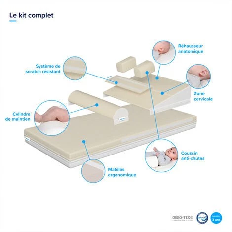 - Ergonomie : Matelas évolutif avec rehausseur anatomique, coussins anti-chutes, système de scratch résistant et cylindre maintien pour assurer à votre petit une bonne position (à retirer pour les siestes et la nuit : bébé doit dormir sur une surface plane sans accessoires).