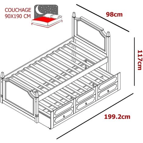 Dimensions du lit : Longueur 199,2 cm x Largeur 98 cm x Hauteur 117 cm