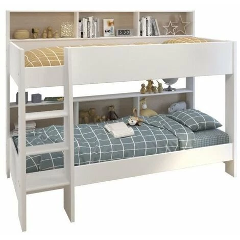 JIM Lit enfant superposé l 90 x L 200 cm – Structure en panneaux de particules décor chene brooklyn et blanc – Style et design contemporain – 3 niches avec fond réversible L 67 x H 27 cm – Sommiers inclus – Livré sans matelas – Fabrication française – Dimensions totales l 132 x L 209 x H 165 cm.
