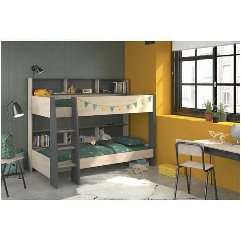 Lits superposés enfant – Modele JIM – 6 niches de rangement : 4 niches de L66,7 x H27,2 x P17,3 cm et 2 niches centrales de L67,2 x H27,2 x P 17,3 cm – Structure en panneaux de particules – Revetement en papier décor Chene Jackson et Gris Ombre – Couchage : 2 x 90 x 200 cm – Sommiers inclus – Livré sans matelas – Dimensions totales : l 132 x L207 x H164,5 cm