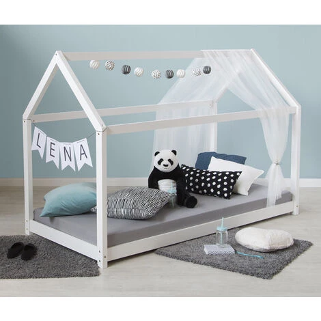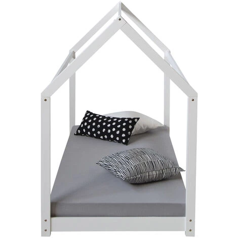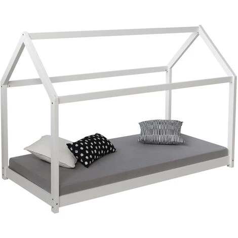 Grand lit en forme de maison 90 x 200 cm coloris blanc. Construction stable en bois massif de 100%. Le linge de lit, le matelas et la décoration ne sont pas inclus. Dimensions : 90 x 200 cm. Dimensions extérieures de lit : 206 x 141 x 96 cm. Matière : bois de pin. Coloris : blanc